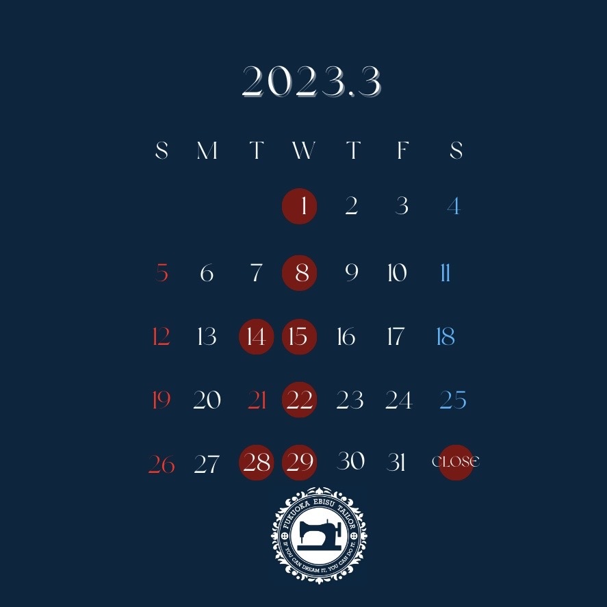 【福岡えびすテーラー】3月の営業案内【2日より営業】
