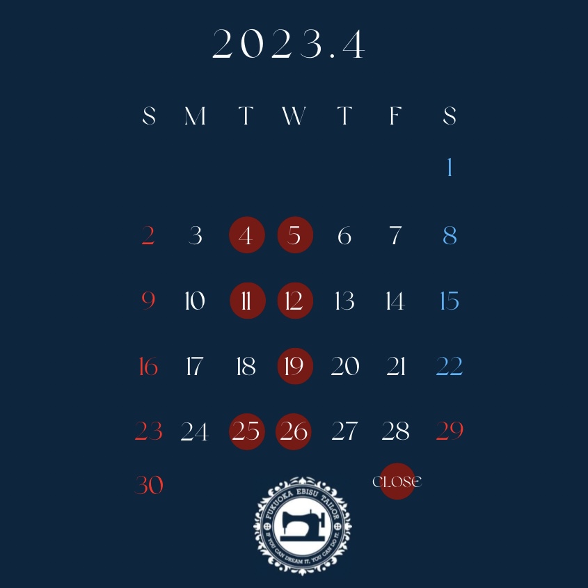 【福岡えびすテーラー】4月の営業案内【1日より営業】