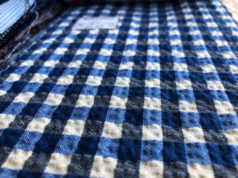 原料は主にコットンで、織り方は暑い季節には定番の平織りですが、このシアサッカーという生地は、タテ糸を緩ませたり強めたりと、強弱をつけてデコボコとした生地に仕上げます。
