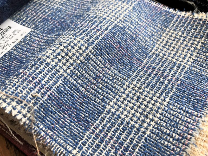 基本的にはウールを用いた平織りですが、上記のリネンを混ぜたものなど暑い夏向けに風通しを良くする為にあえて目付を軽くした生地で、薄くコシがあって見た目もサラッとしたドライな印象で夏の代表的な生地といえます。