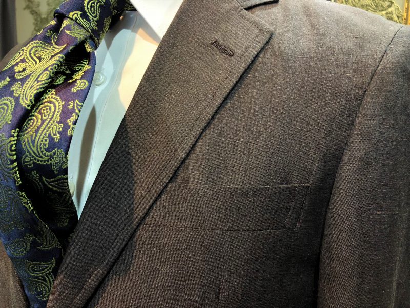 ドライでザラっとした手触りで清涼感のある生地で着用時にヒンヤリとするリネンはムシムシしたこれからの季節にピッタリです。薄いベージュや白のカジュアルなイメージが強くビジネスシーンで使いにくいのではないかと思われがちですが、多くの生地メーカーがシックなカラーを含め沢山のカラーを発表しています。