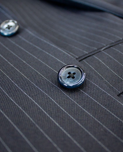 生地に合わせた濃紺のボタンはクロス掛けで丁寧に取り付け