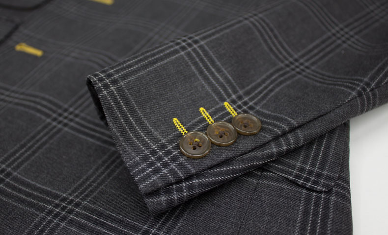 グレーのチェックにイエローのボタンホールカラーがピリっと良いアクセントになっています
